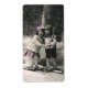 Vintage Merry Christmas sepia photo of best friends, a little boy and a little girl, two children having fun skiing in the snow during winter. It is snowing in the forest.