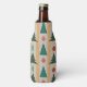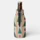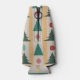 This bottle cooler has mid-century modern design of Christmas trees and ornaments strung on a garland with a gold and silver background.