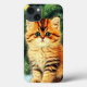 iPhone Case featuring a vintage Christmas cat! An orange kitty with black stripes sits in the snow. Behind the cat is a Christmas tree with red and yellow ornaments. Also on the snow is a red present. A perfect gift for the Christmas season and cat lovers!