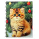 Notebook featuring a vintage Christmas cat! An orange kitty with black stripes sits in the snow. Behind the cat is a Christmas tree with red and yellow ornaments. Also on the snow is a red present. A perfect gift for the Christmas season and cat lovers!