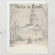 Vintage illustration Victorian Christmas holiday religious design featuring a church in a winter landscape with trees. There is snow on the ground and parishioners are arriving for services. Beautiful antique tones with bright colours of red and green in the windows.