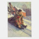 Vintage illustration Merry Christmas holiday image featuring a dad with his little girl having fun sledding on a sled or toboggan down a snow covered hill in winter.