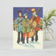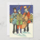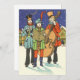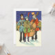 Vintage illustration Merry Christmas holiday design featuring a group of people playing instruments and singing Christmas carols at night. This group of musicians includes a man in a hat playing the musical cello and another playing a clarinet and the man in the middle holding a song book as the lead singer sings Silent Night. A beautiful winter night with stars and a moon in the sky and fresh snow on the ground