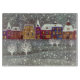 Vintage illustration Victorian Merry Christmas holiday image featuring a jolly Santa Claus riding in a one horse open sleigh on Christmas Eve. It is snowing during the winter with a sleepy town in the distance. White trees covered with their branches covered in snow while snowflakes fall gently from the night sky.