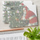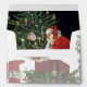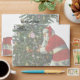 Vintage illustration Merry Christmas holiday design featuring a jolly Santa Claus lighting candles on a decorated Christmas tree with wrapped gifts and presents underneath. Season's Greetings and Happy Holidays!! Ho, ho, ho!