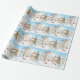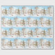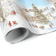 This wrapping paper features a repeating horizontal border design depicting an idyllic, snowy village scene under a pale blue winter sky with a soft, bright sun. The illustration centres on a picturesque pink-roofed town hall and a tall snow-laden evergreen tree, flanked by a bare deciduous tree. Scattered throughout the deep white snow are small figures, including a person in a bright red coat pulling a sled and children playing, which brings a warm, cosy feeling to the cold landscape. The entire scene is rendered in a charming, slightly whimsical storybook style, creating a cheerful, repeating winter motif.