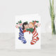 Vintage illustration Christmas image featuring two children hanging in Christmas stockings decorated with holly leaves and berries. The boy is in the red and white striped stocking and the girl is in the blue and white striped stocking.