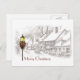 A black and white sketch of a Victorian village with the only colour being that of the street lamp and Christmas decorations. Reprinted on this postcard.