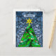 These beautiful Christmas greeting postcards feature a hand made watercolor stained glass design featuring a Christmas tree with a gold star with red ornaments with a background in shades of blue. The editable greeting is "Merry." The back has the editable message, "Wishing you peace, love and joy this holiday season," with placeholders for your name and year in a signature style font along with sender name and return address.