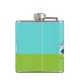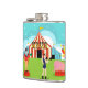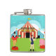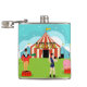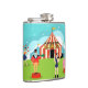 Step right up, folks! Step right up to the amazing Vintage Circus Flask. Yes, come one, come all! This mid century modern, minimalist art design features a cartoon drawing of a genuine, three-ring circus. Take it all in. On the lush, green grass, you can see a ringmaster wearing a red coat with tails, orange pants, and a black top hat. In one hand he is holding a green megaphone, which allows him to be heard while telling you to step right up! Behind the ringmaster, there is a beautiful woman juggling five balls. Judging from the stars on her navy skirt and orange top, she is a star of the show. To the left of the man with the megaphone, we see a brawny, muscleman. It takes confidence to pull off a navy, one-shouldered, unitard, but Mr. Strong Man does it with style. My goodness! Check out those bulging biceps as his lifts that dumbbell as if it's as light as a feather. His black, handlebar moustache looks as manly as the rest of him. To the left of the body builder, there is a pink, baby elephant standing on a red podium. Don't worry. The juvenile pachyderm appears to be as tame as a kitten. Towards the rear of the scene, we can see a mad-capped man making a real clown of himself. He didn't buy that red and yellow, harlequin style suit off the rack! His blue hat, orange and yellow hair, white face paint, and red nose would make him unrecognisable to his own mother. And this is only the excitement we can see! Who knows what lively antics are playing out in the three big tops that grace the background! Two blue and aqua tents are flanking a giant red and cream striped big top tent with yellow and black letters that spell out, "CIRCUS." A yellow, banner flag is waving from the top of each tent. The sky is shades of aqua, teal, blue and white and is filled with magical, white stars. Just like the circus itself, this design is fun for the whole family and is perfect for children of all ages!