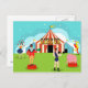Step right up, folks! Step right up to the amazing Vintage Circus Postcard. Yes, come one, come all! This mid century modern, minimalist art design features a cartoon drawing of a genuine, three-ring circus. Take it all in. On the lush, green grass, you can see a ringmaster wearing a red coat with tails, orange pants, and a black top hat. In one hand he is holding a green megaphone, which allows him to be heard while telling you to step right up! Behind the ringmaster, there is a beautiful woman juggling five balls. Judging from the stars on her navy skirt and orange top, she is a star of the show. To the left of the man with the megaphone, we see a brawny, muscleman. It takes confidence to pull off a navy, one-shouldered, unitard, but Mr. Strong Man does it with style. My goodness! Check out those bulging biceps as his lifts that dumbbell as if it's as light as a feather. His black, handlebar moustache looks as manly as the rest of him. To the left of the body builder, there is a pink, baby elephant standing on a red podium. Don't worry. The juvenile pachyderm appears to be as tame as a kitten. Towards the rear of the scene, we can see a mad-capped man making a real clown of himself. He didn't buy that red and yellow, harlequin style suit off the rack! His blue hat, orange and yellow hair, white face paint, and red nose would make him unrecognisable to his own mother. And this is only the excitement we can see! Who knows what lively antics are playing out in the three big tops that grace the background! Two blue and aqua tents are flanking a giant red and cream striped big top tent with yellow and black letters that spell out, "CIRCUS." A yellow, banner flag is waving from the top of each tent. The sky is shades of aqua, teal, blue and white and is filled with magical, white stars. Just like the circus itself, this design is fun for the whole family and is perfect for children of all ages!