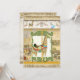 This Baby Shower invitation features a vintage circus poster image in the background along with original watercolor artwork by Audrey Jeanne Roberts to give an antique feel yet it is brand new art! Perfect for the new baby boy, both adorable and yet with the feel of wild jungle animals in bright modern colours welcoming your new little one to the world! The central image is a hand painted Giraffe Carousel Horse Animal with elegant detail in the saddle, and golden pole. It is set in very detailed swirled leaf frame of antiqued lime green, overlaid on an aged, grunged, worn, sanded away vintage circus poster image with grey and deep harvest gold colours. The top border is of original art carousel animals painted by Audrey Jeanne - a white horse, a blue seahorse, the giraffe and a bunny on each end. The background papers on this design are worn, aged, stamped, inked and painted with various shades of cream, tan, brown and off white.
