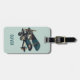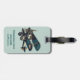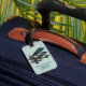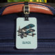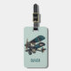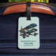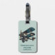 This unique travel tag features a distressed vintage painting of a classic biplane soaring through the sky. The aircraft, rendered in a cool palette of greens, stands out against a green background.