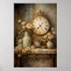 An antique clock surrounded by soft roses and vintage decorative elements in warm neutral tones. The composition creates a romantic shabby chic atmosphere with timeless floral details.