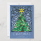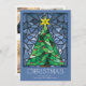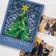 These bright and colourful 5" x 7" flat Christmas greeting cards feature a handmade watercolor stained glass window design of a green Christmas tree with a gold star and red ornaments framed in shades of blue on a dusty blue background. The greeting is "Christmas," in large decorative letters with an editable greeting, "Wishing you peace, love and joy this holiday season."