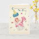 A vintage greeting card illustration features a smiling new baby tucked inside a baby bottle adorned with a pink ribbon. The front of the card says, "Congratulations on the New Baby" and the message inside the card is: "Wishing you and your newborn many years of good health, love, and happiness."