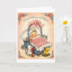 A vintage greeting card image features an adorable new baby snuggled into a blue wicker basket with pink and white bedding. A big pink bow is tied to the basket handle. Alongside the basket are a stuffed teddy bear and a yellow duckie pull toy. Pink and blue flowers decorate each corner of the image. The front of the card says "Congratulations and Welcome" and the message inside the card is "Welcome to the world, little one. May you always be kept safe and snug."