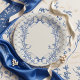 This image is a beautifully crafted vintage-style birthday invitation featuring elegant, hand-drawn floral and bow illustrations in soft blue on a cream background. The central frame is an ornate oval garland of wildflowers and leaves, topped and bottomed with charming bows, giving the design a delicate, classical aesthetic reminiscent of antique French stationery or toile patterns.