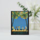 French and European Travel Advertisements - Beach, people, palm trees, blue sea and sky illustration