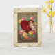This greeting card shows a large red heart in the center that looks soft and plush. To the right, a round-cheeked cherub with small white wings floats in the air, aiming a gold arrow as tiny sparkles fall below it. A ring of flowers surrounds the scene, with pink and yellow roses mixed with small light-blue forget-me-nots. Behind everything is a dark, aged gold background with fine cracks that make it feel old-fashioned. A cream border with raised swirls and floral details frames the picture and gives it a classic finish. There isn’t any printed message visible on the front, so the artwork does all the talking 💘❤️.