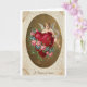 This design shows a vintage-style Cupid resting on a deep red heart, looking outward with a sweet, knowing expression 🥰. The Cupid has soft golden curls and pale pastel wings, and his relaxed pose makes the scene feel gentle and affectionate. The heart is covered with flowers, including light pink roses, small blue forget-me-nots, and trailing green ivy. A gold arrow runs through the heart, and tiny gold specks seem to scatter across the aged, crackled gold background. Around the scene is a creamy border with raised, curling details, plus light sepia marks that make it feel old and well kept. There isn’t any readable text on the front, so the picture does the talking and leaves room for your own words inside ❤️. It feels meaningful to give because it nods to classic romance and reminds someone they’re cared for in a simple, lasting way.