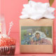 Vintage illustration children and babies image featuring a cute baby playing with toys in a crib after waking up from a nap. Adorable rabbits, a duck and a wolf with a basket decorate the crib and blanket. Neutral colours make this a great design for a boy or a girl!