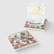 The coasters are gorgeous, a quality feel and heavy weight. They look like a precious archeological find. A rustic stone juxtaposed with a modern floral black and white print. I like the way the print goes slightly imperfect on the cut stone edges giving them a kind-of natural beauty.