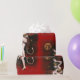 This wrapping paper is illustrated with a vintage devil lady dancer. The background is red with a skull faced moon and stars.