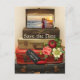A romantic vintage destination wedding or travel inspired Save the Date postcard, featuring your own favourite engagement photo on a pile of suitcases with vintage flowers.