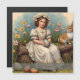 A young girl in an elegant vintage dress sits on a wooden log, holding a beautifully decorated Easter egg. Surrounded by blooming flowers and a curious rabbit, the scene exudes warmth, nostalgia, and the spirit of Easter.