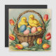 Cute old-fashioned yellow Easter chicks are sitting in an egg-filled basket with vibrant tulips all around. This square magnetic card provides just the right amount of nostalgia and fun for your customers this spring.
