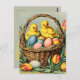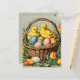 Cute old-fashioned Easter chicks are sitting in an egg-filled basket with vibrant tulips all around. Personalise the other side of this postcard with the details of your party .