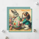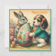 A vintage painting of the Easter Bunny wearing a pink bow. The bunny is presenting a beagle dog a large decorated Easter egg. This would be a great card for a child who loves collecting all Easter memorabilia. It will create happy memories. Room for writing on the back of the card under a small version of the front picture. Created with the assistance of COPILOT DESIGNER (bing.com).