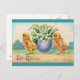 This sweet postcard features a vintage Easter design, of two chicks carrying an egg full of flowers, with the text "Easter Greetings". The border colours can be customised to fit your needs.