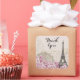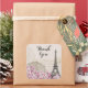 A fancy thank you sticker. A whimsical vintage collage which has an old french postcard background with an eiffel tower sketch and some pink and white wildflowers bordering the bottom. Fancy swirly embellishments decorate the sides.