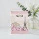 This postcard features a vintage drawing of the Eiffel Tower in Paris, France with pink flowers. The postcard says "Merci", or "thank you" in French.