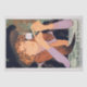 Vintage poster for a French exhibition with a lady wearing a black hat and a purple dress holding a white flower. Pale green border. Great for decoupage.