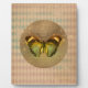 An enchanted green and gold butterfly lays in the centre of a round brown and gold ephemera panel with a distressed muted colours harlequin background. A combination that suits a variety of decor themes vintage and modern...
