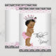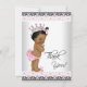 Girl baby shower thank you card with pink and black lace background and adorable ethnic vintage princess baby girl wearing pretty crown, ruffle pants, pink bunny slippers and pink bow in her hair. This cute pink flat style princess baby shower thank you card is easily customised by adding your message in the font style, font size & colour, and wording of your choice, or leave blank to add your handwritten message after they arrive.