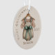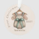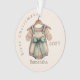 Celebrate a precious milestone with this whimsical holiday ornament. It features a delicate watercolor illustration of a vintage-style baby romper hanging on a wooden hanger with a soft sage green bow. This keepsake makes a thoughtful gift for new parents or a charming addition to a classic nursery-themed tree.