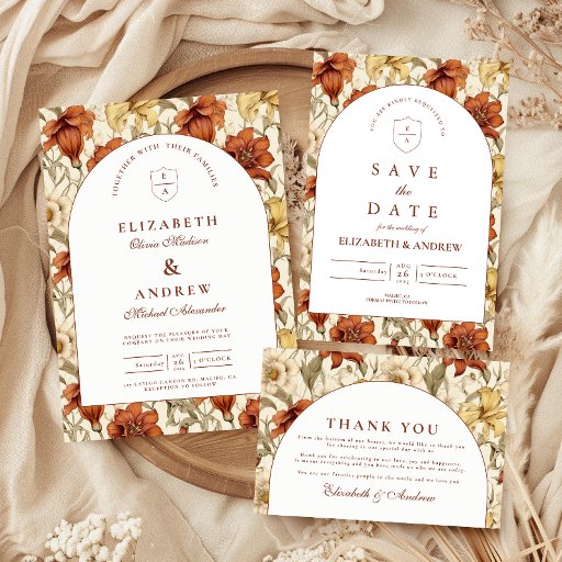 Set the tone for a timeless and romantic event with this vintage floral design, featuring a beautifully detailed botanical pattern in warm, earthy tones. The elegant arched layout creates a soft, refined focal point, while the rich florals add depth and a classic storybook charm. Perfect for fall weddings, garden settings, or couples who love a romantic vintage aesthetic, this design feels both graceful and enduring, with just the right touch of old-world elegance.