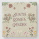 A vintage garden stone coaster display with floral elements and custom text, in muted green, red, pink, white and yellow colours.