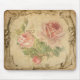 Beautiful heirloom pink roses framed by an engraved ornate scrollwork banner on a linen textured background.
