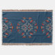 Vintage throw blanket with decorative plants pattern on dark blue background.