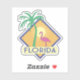 Vintage look Florida design in art deco style with a palm tree, flamingo, and sun in a diamond shape with FLORIDA in a deco font and a retro beach colour palette.
