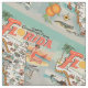 This pattern made from a vintage Florida postcard and shows the tourist attractions of the state, along with colorful illustrations of oranges, an alligator, a palm tree, and a bathing beauty. Fun kitsch from Florida history.