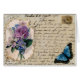 An antique, hand written french postcard makes a wonderful backdrop for the bouquet of flowers and blue butterfly in the corner.