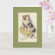 Vintage French New Year greeting card. Adorable cat with a blue bow sitting on a fluffy pillow. Bonne Année!