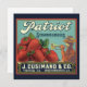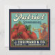 Vintage illustration Fruit Crate Label art advertisement featuring a man blowing a bugle or trumpet playing music and a big bunch of red ripe organic berries. Advertising for Patriot Strawberries, healthy, fresh fruit from the farm fields.