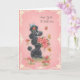 A vintage get well card illustration features a cute black poodle sitting up on its haunches and holding a big bouquet of pink flowers with yellow butterflies flying around. The front of the card says, "Hope You'll Be Well Soon." The message inside the card is, "I hope it doesn’t take too long for you to start wagging your tail again. Warm wishes for a speedy recovery."